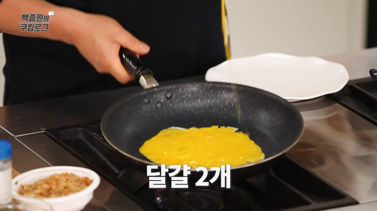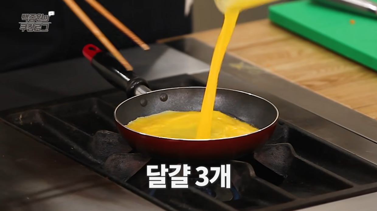 프라이팬에 기름을 두르고 예열이 되면 달걀물을 넣는다.