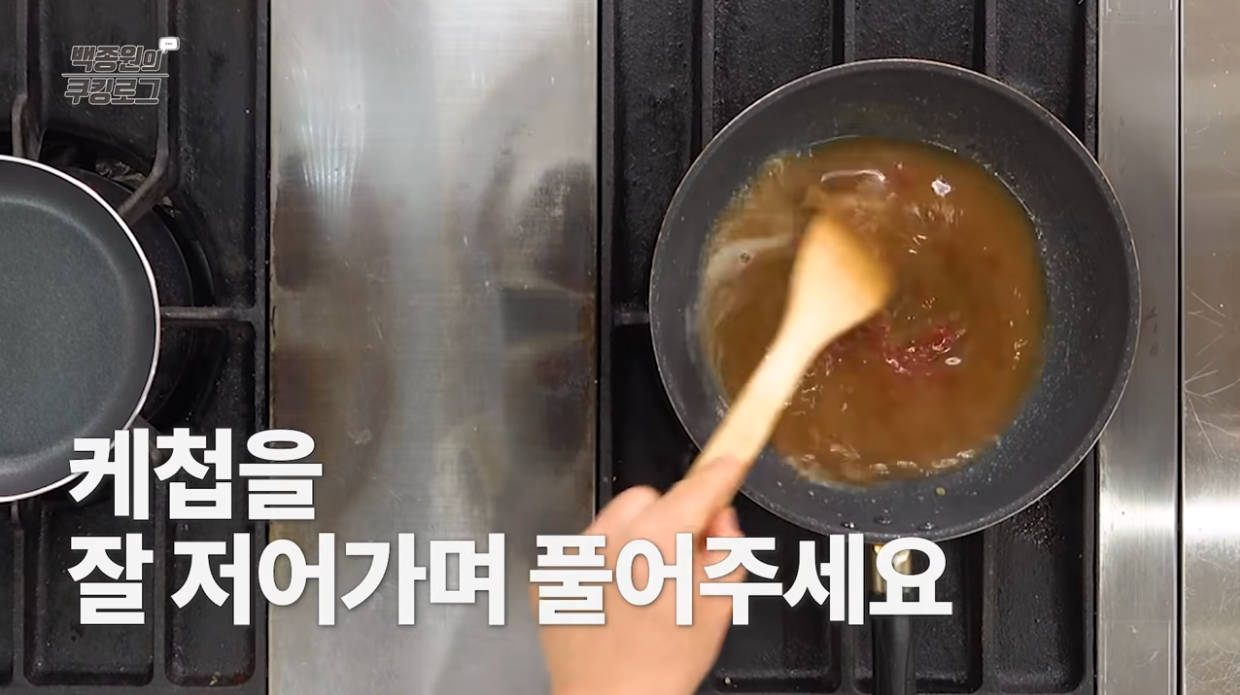 덩어리가 다 풀리면 케첩, 간장, 황설탕, 후추를 넣어 농도 나게 끓인다.
