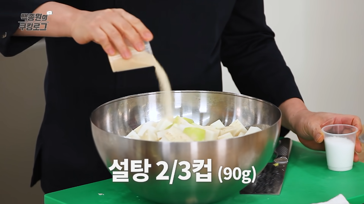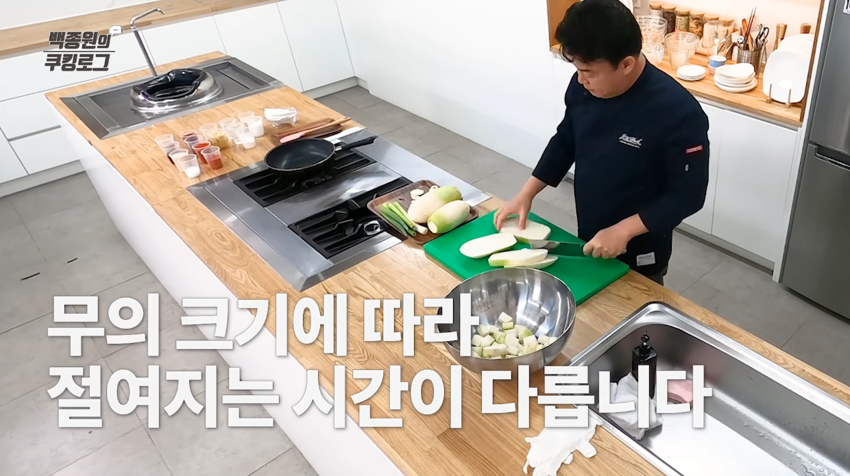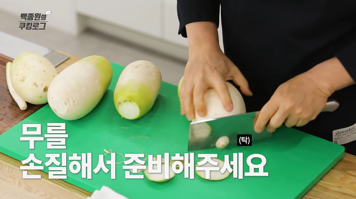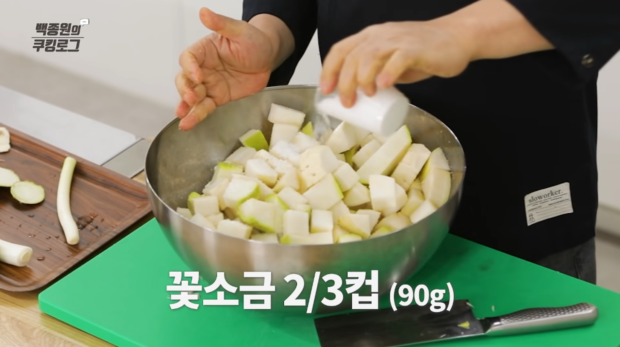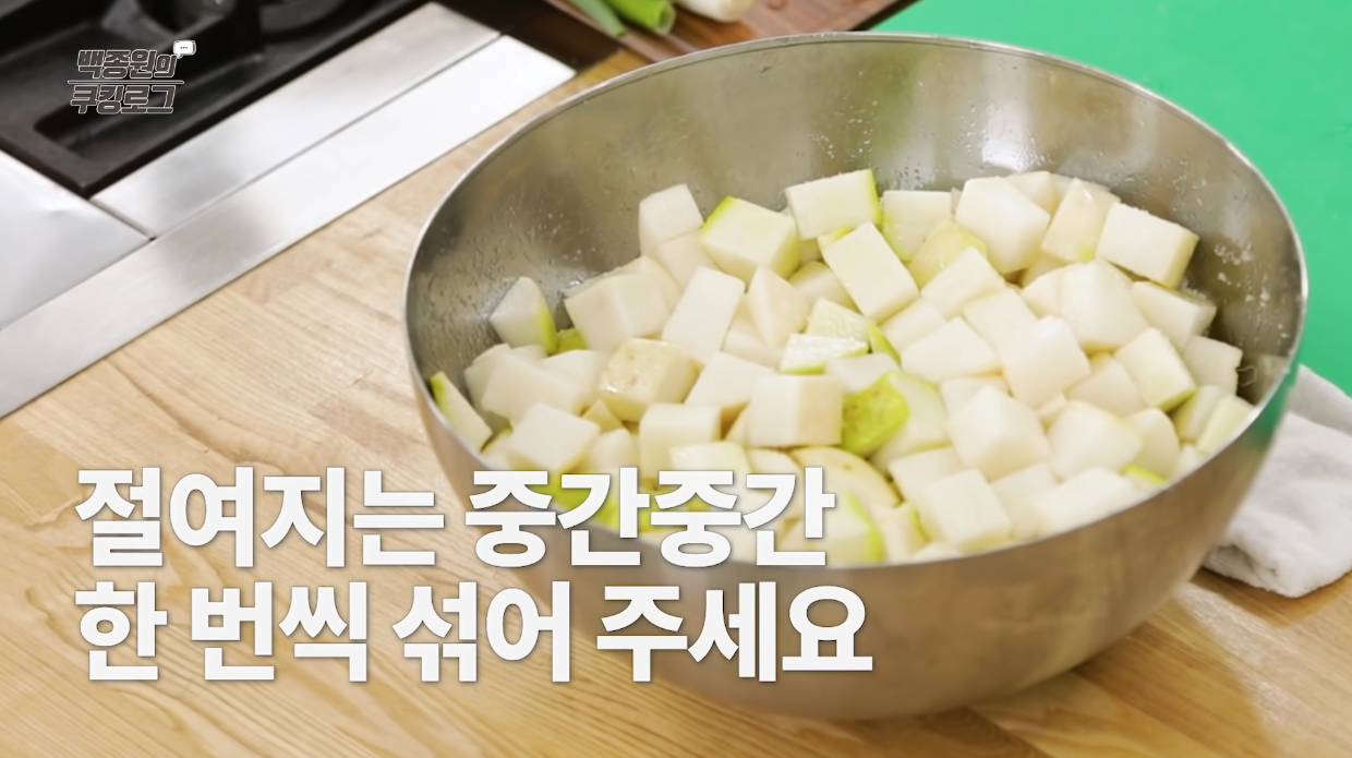 무는 세척하여 사방 3cm 정도 정육면체로 잘라 준비한다.