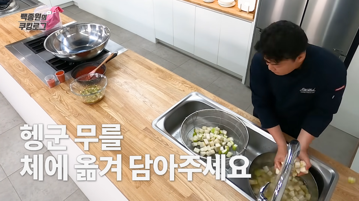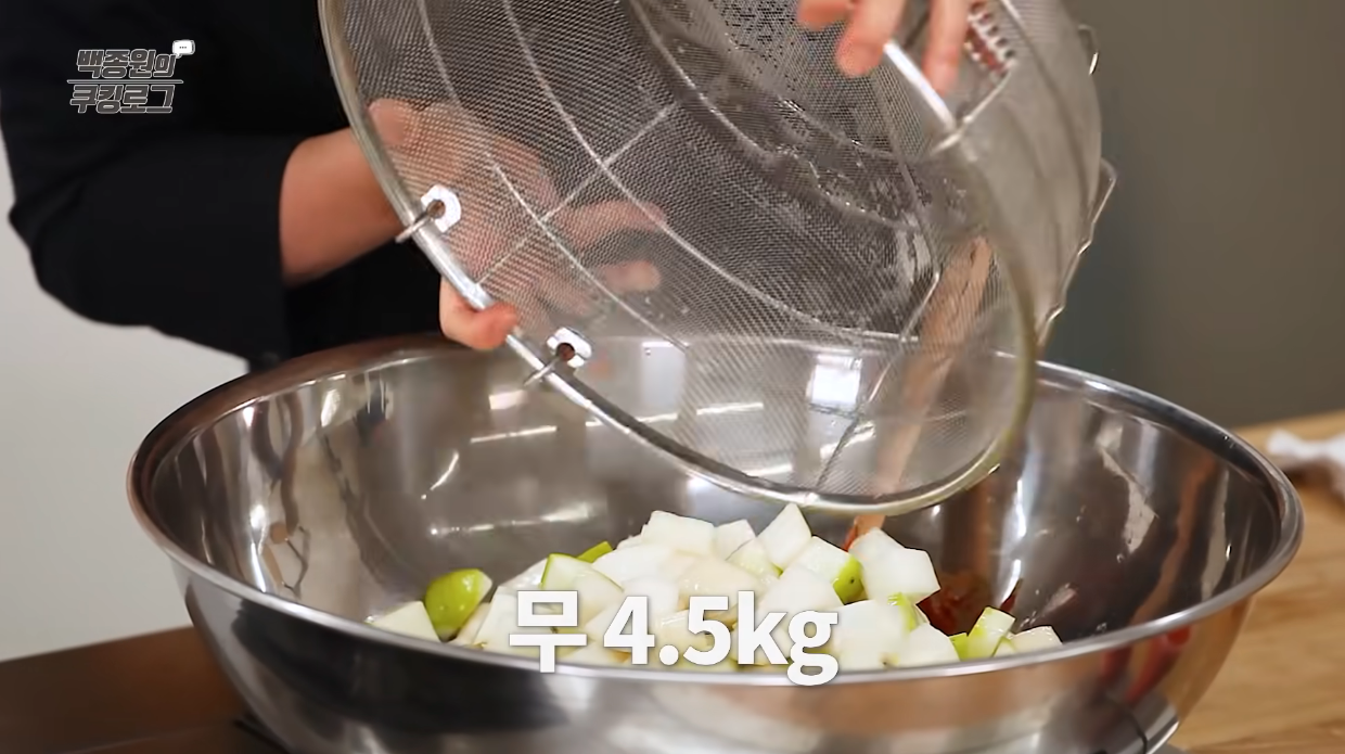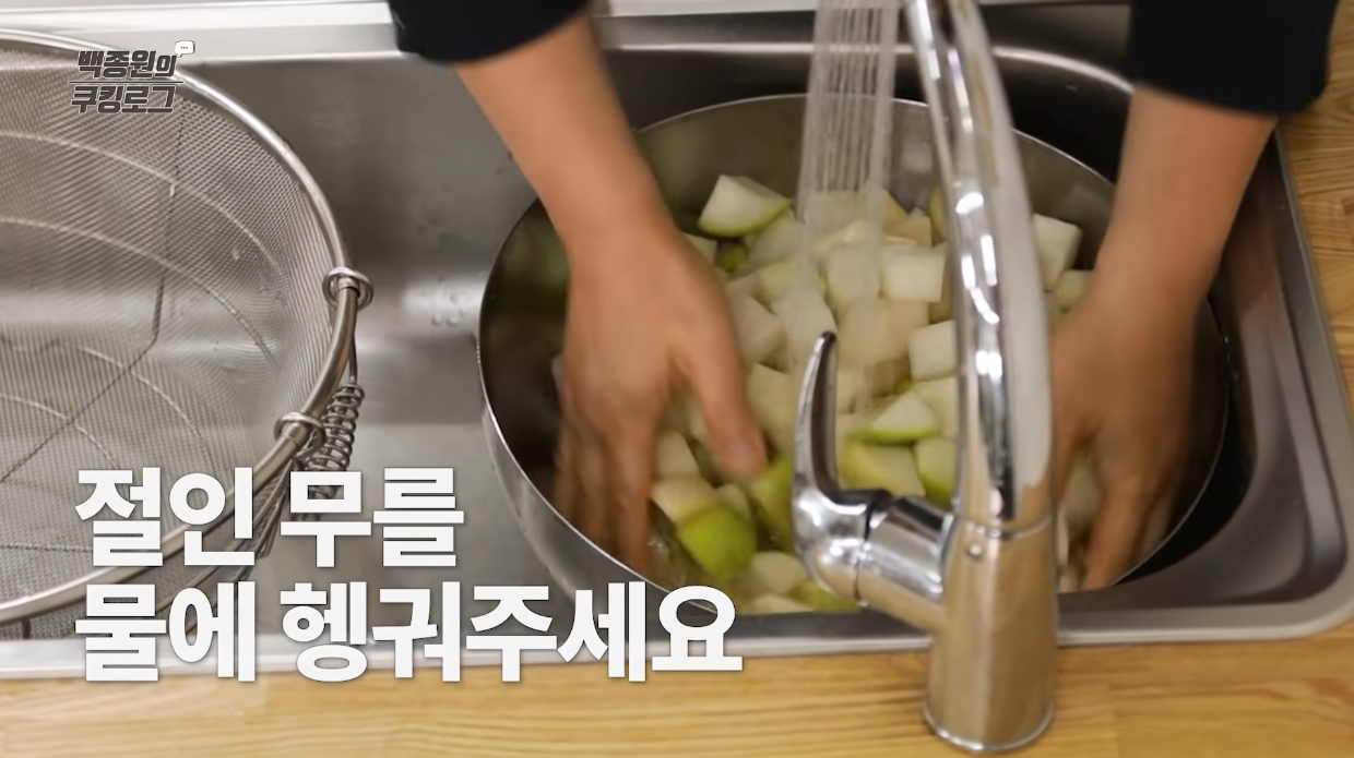 절인 무는 체에 밭쳐 헹군 후 물기를 제거한다.
