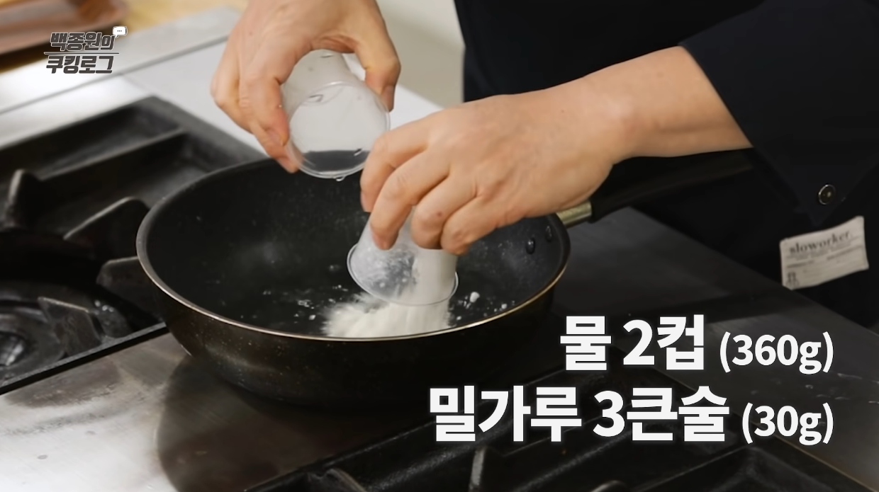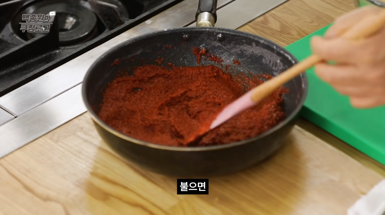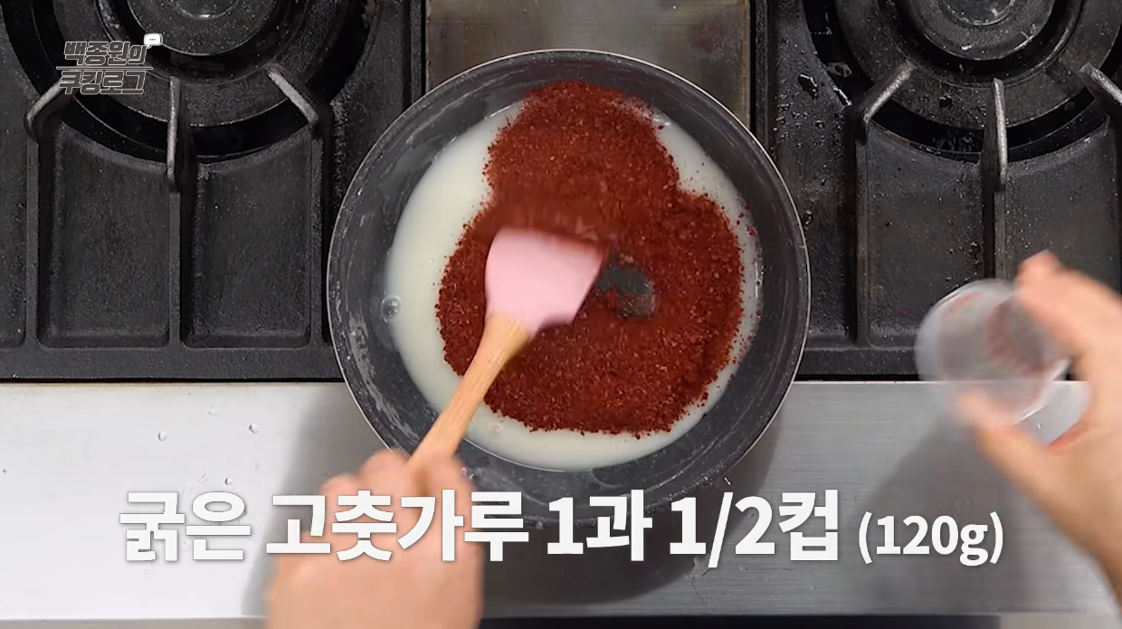 끓인 밀가루 풀에 굵은 고춧가루를 넣어 불려준다.