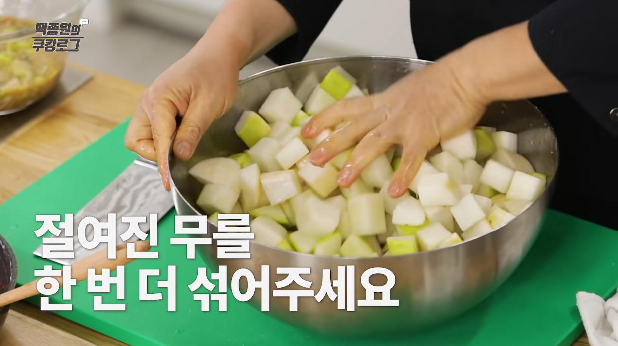 양념장에 들어가는 모든 재료를 한데 섞은 후 무에 넣어 버무려준다.