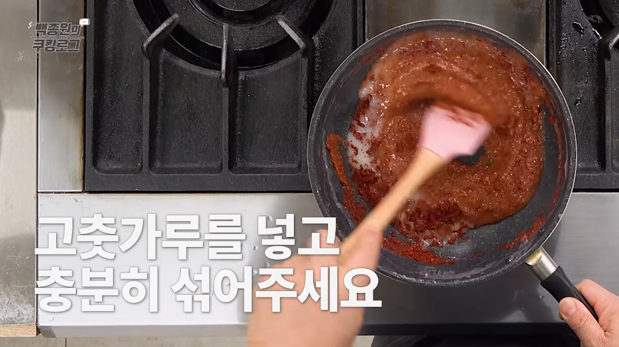 고춧가루를 섞어 둔 밀가루 풀을 양념장과 섞어준다.