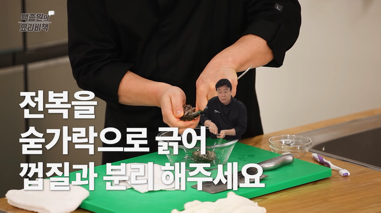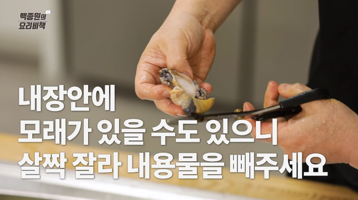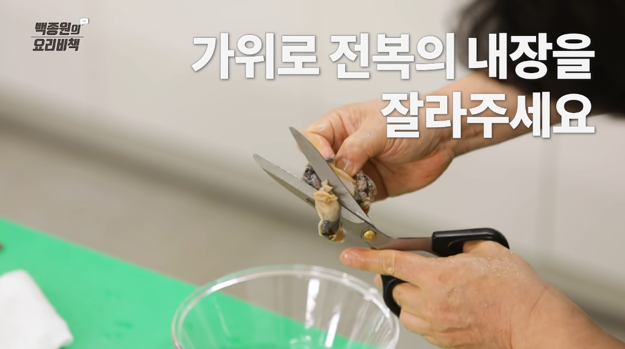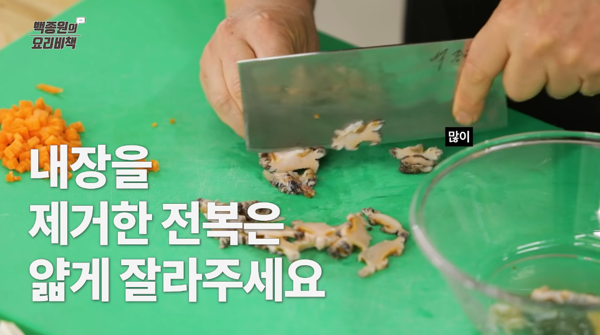 Tip: 냉동이나 죽은 전복을 사용할 경우에는 내장이 신선하지 않아 비린내가 날 수 있으므로 내장을 사용하지 않는다.