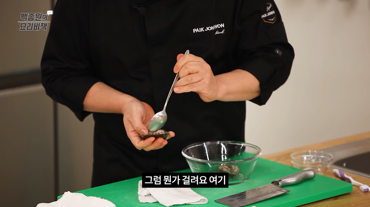 씻은 전복은 껍질의 두꺼운 쪽과 얇은 쪽 중 얇은 쪽 방향에 숟가락을 넣고 살살 긁어서 껍질과 분리한다.