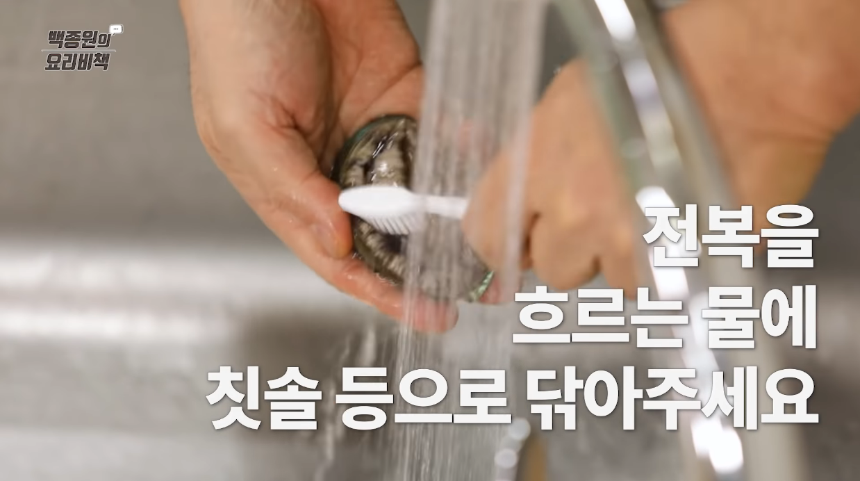전용솔이나 칫솔을 이용하여 전복살의 구석구석 이물질을 흐르는 물에서 잘 닦는다.