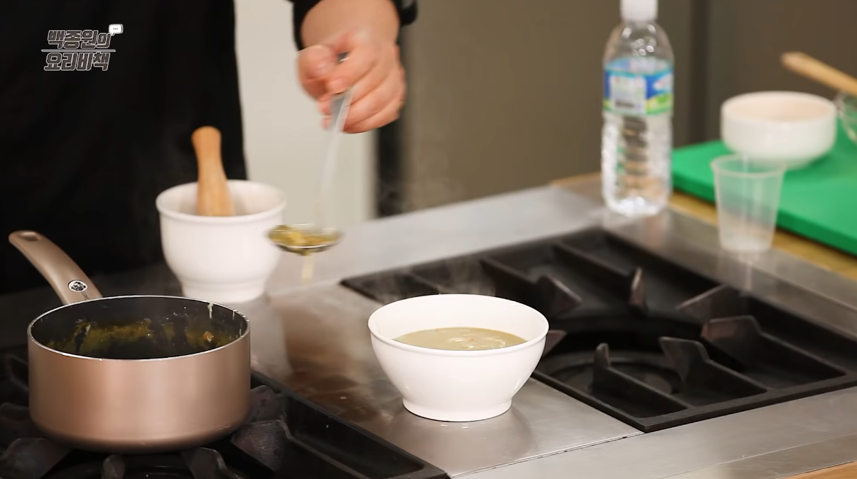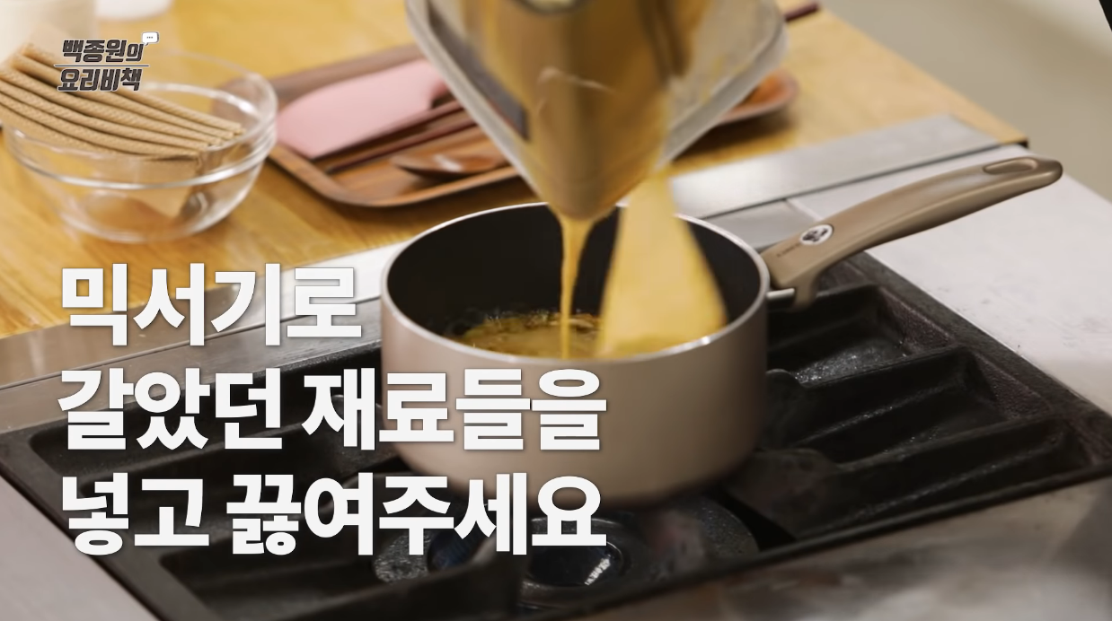 갈아둔 재료, 남은 정수물을 넣고 주걱으로 저어주면서 끓인다.