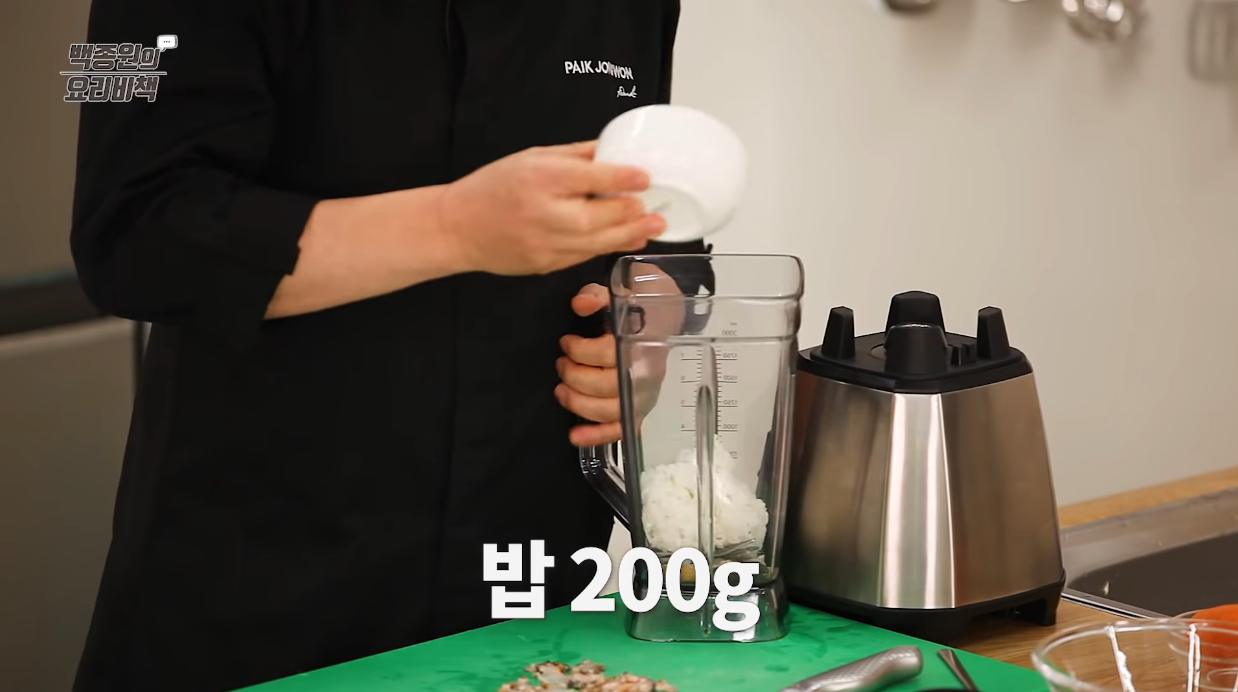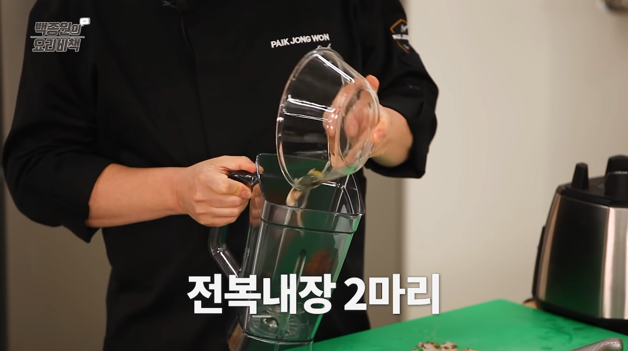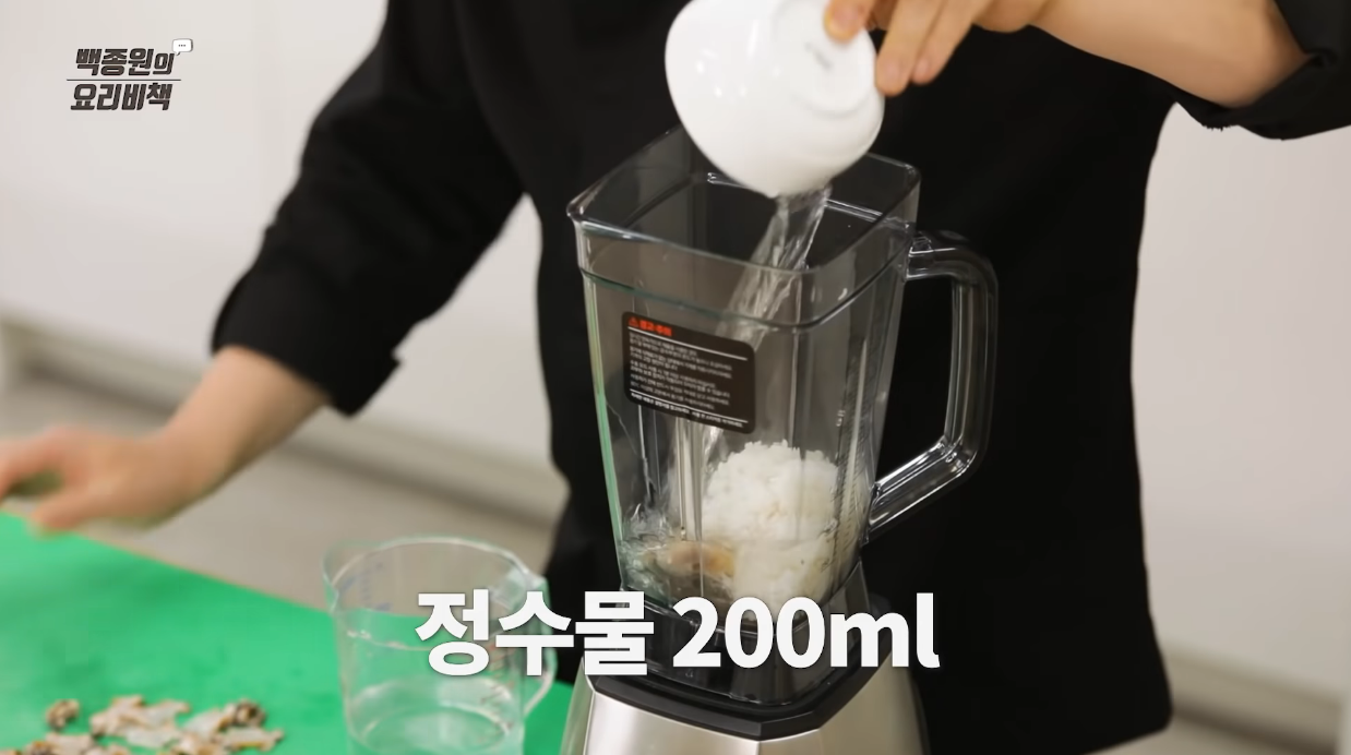 믹서기에 전복내장, 밥, 준비된 정수물의 1/2양을 먼저 넣고 간다.
