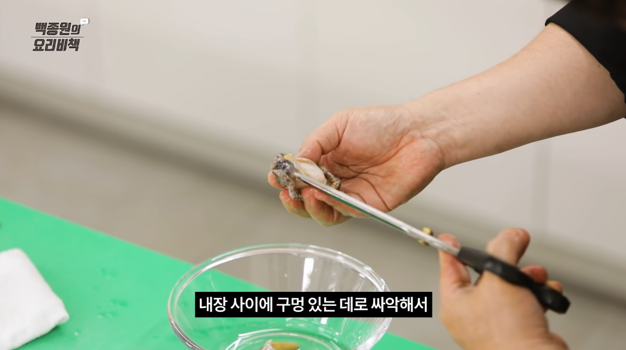 전복살에 붙어있는 뾰족한 모양의 내장부분을 뽑아낸 다음 내장의 볼록한 부분을 가위로 살짝 잘라내서 내장을 빼주고 내장과 살이 붙어있는 경계를 동그랗게 따라가면서 잘라낸다.