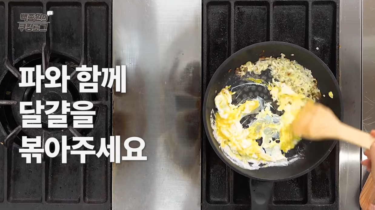 달걀을 팬에 넣어 한쪽에서 스크램블 하듯 볶아준다.
