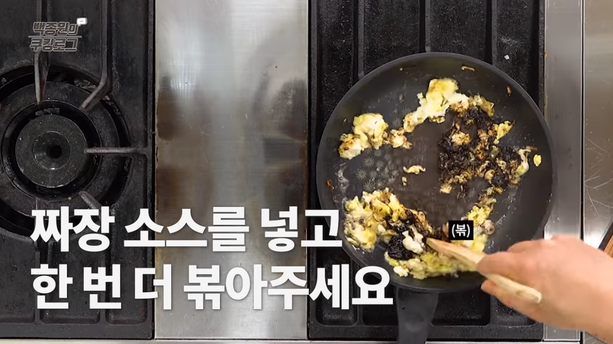 스크램블이 되면 대파와 함께 섞고 짜장 소스를 넣어 볶아준다.