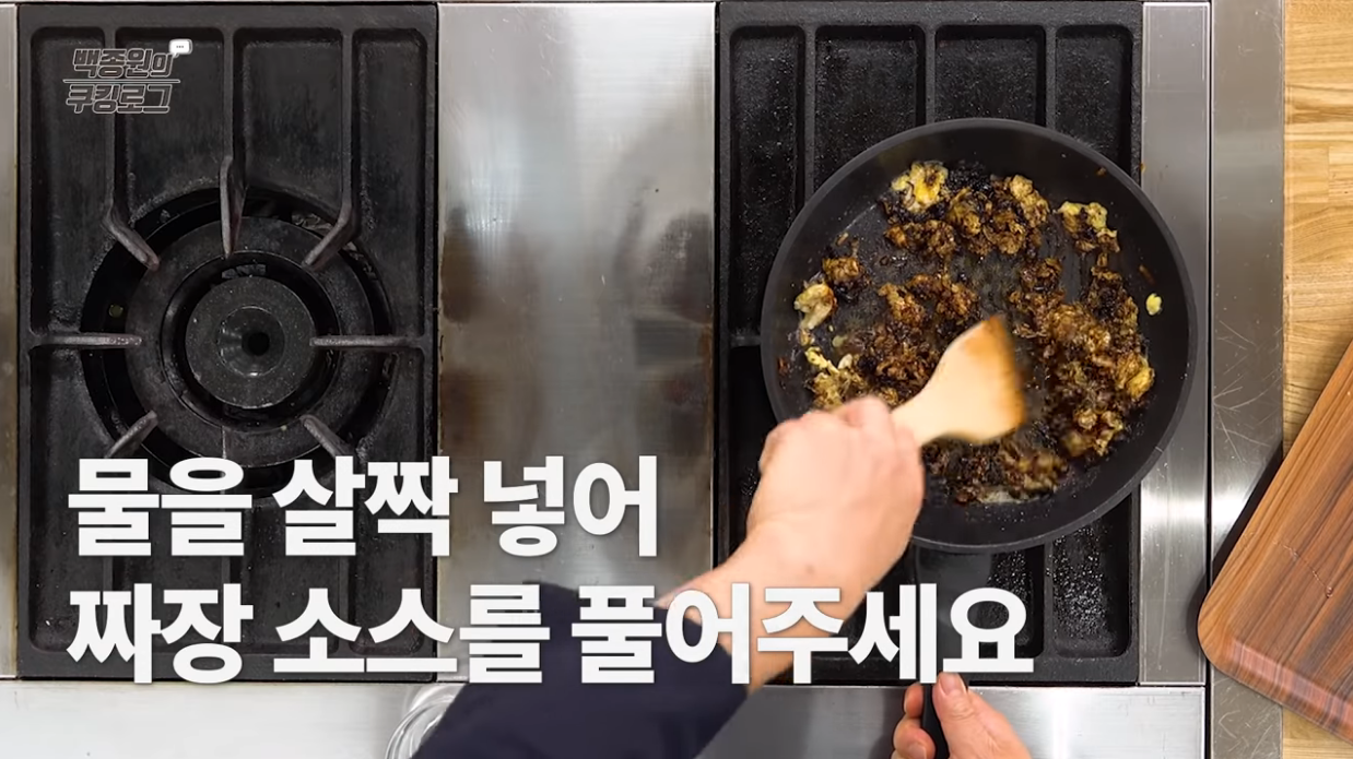 짜장 소스가 어우러지도록 물을 살짝 넣어 볶아준다.