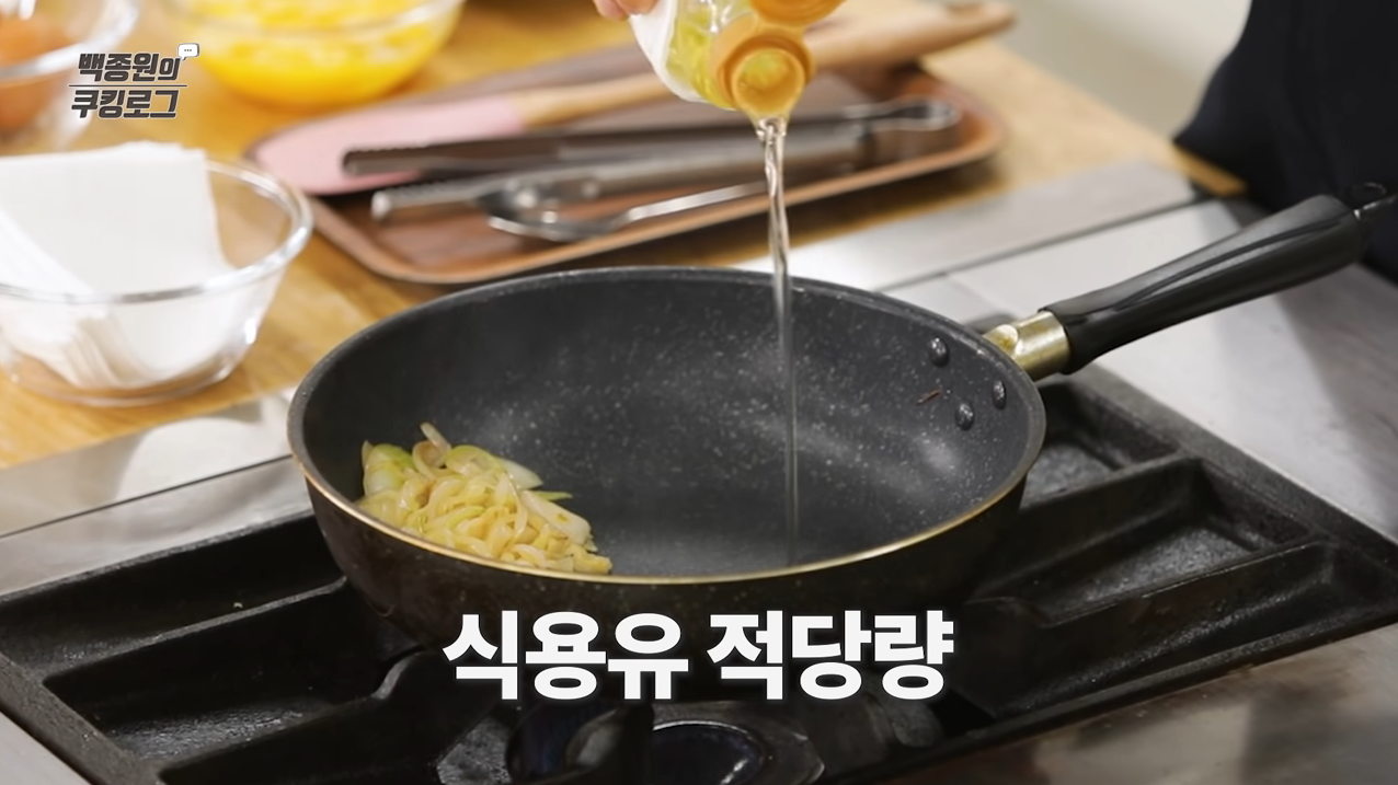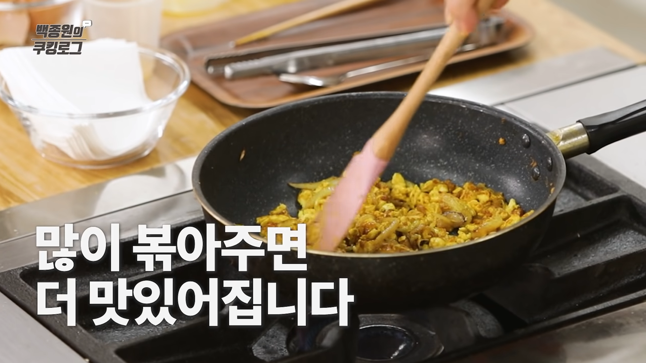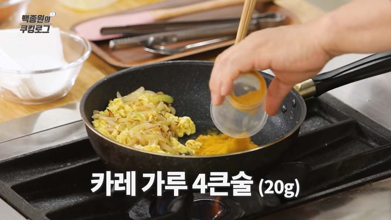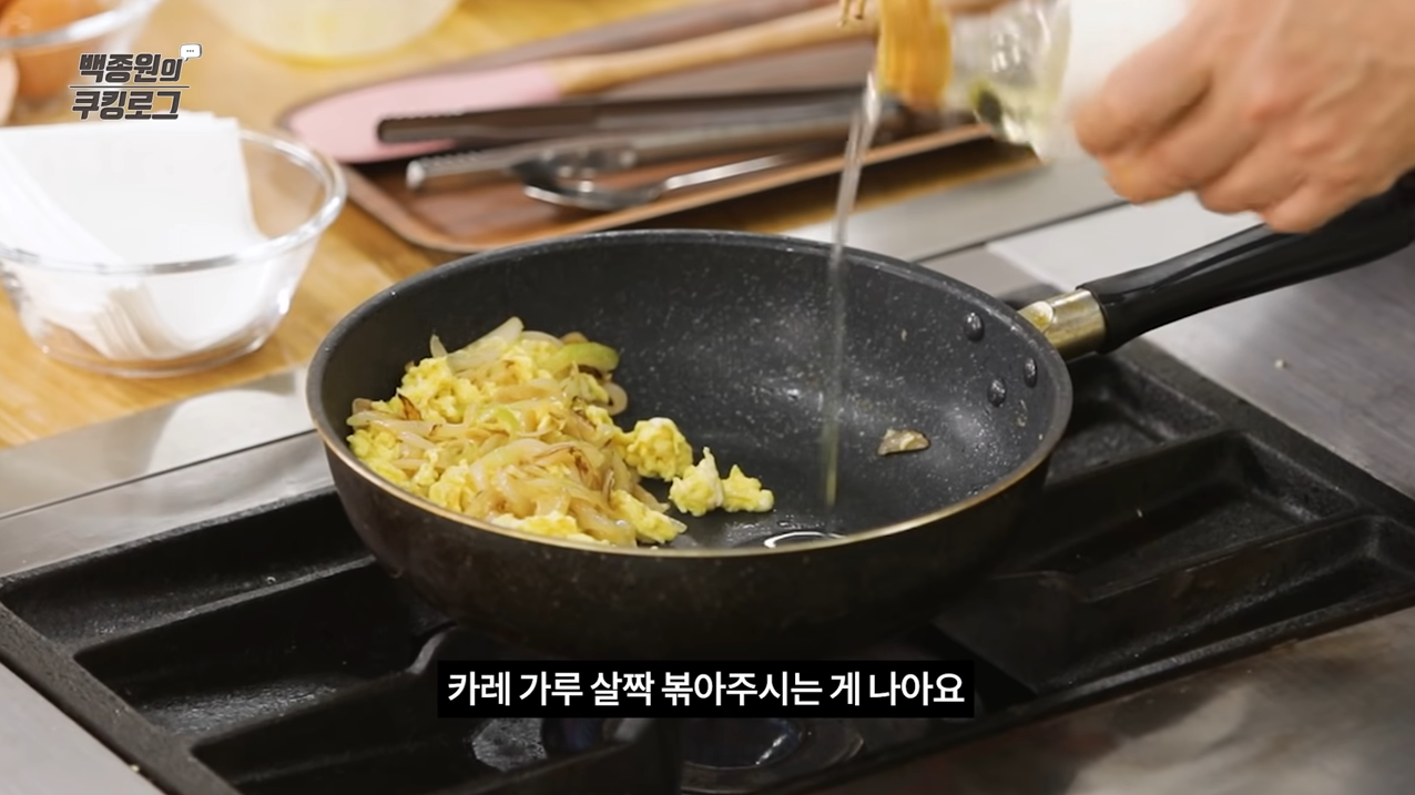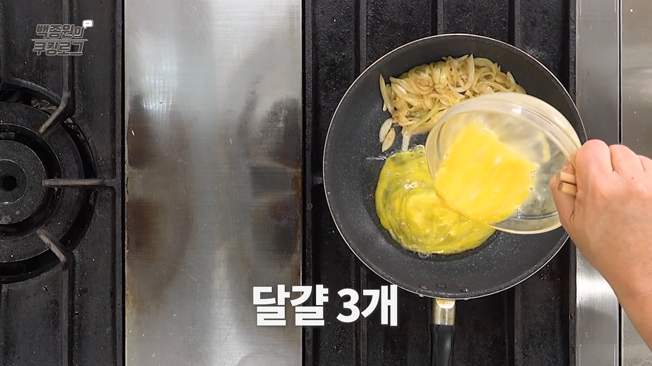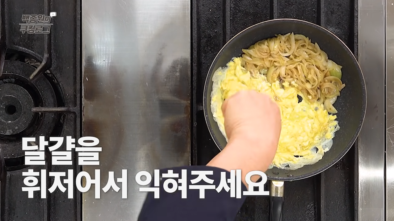 기름을 두르고 달걀을 넣어 스크램블 한 후 양파와 섞어준다.