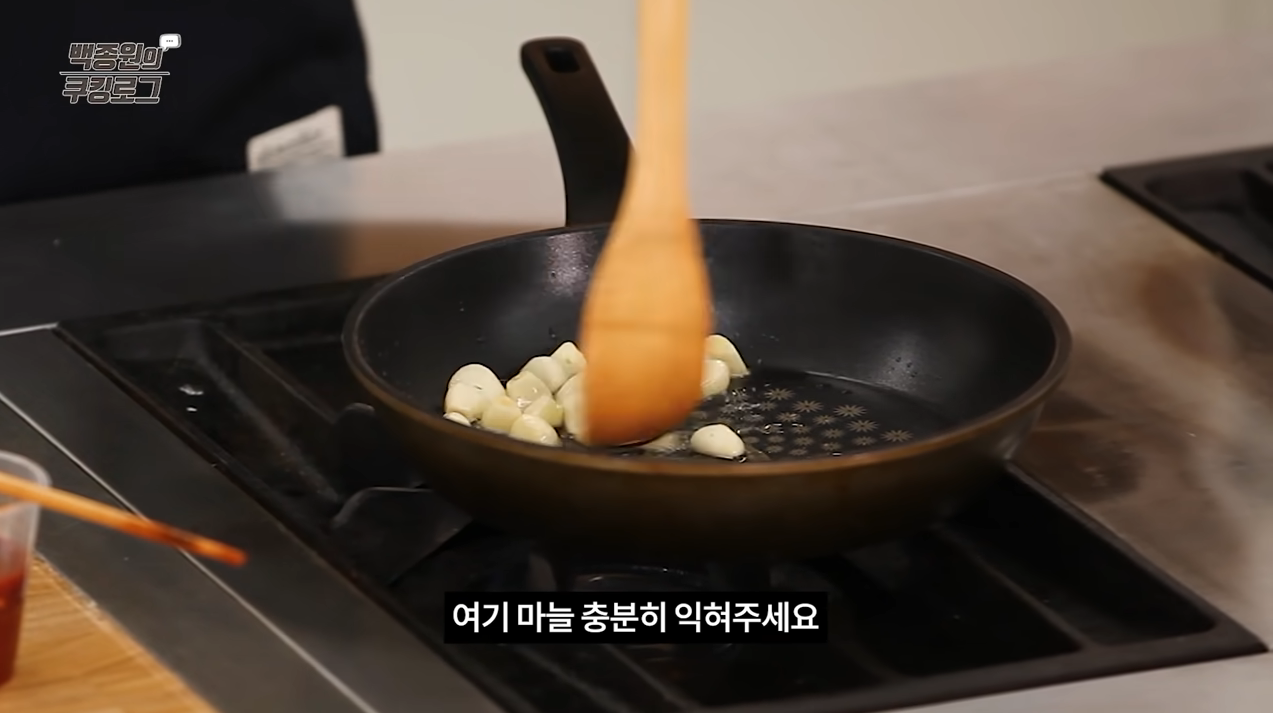 팬에 기름을 두르고 마늘을 넣어 튀기듯이 볶는다.