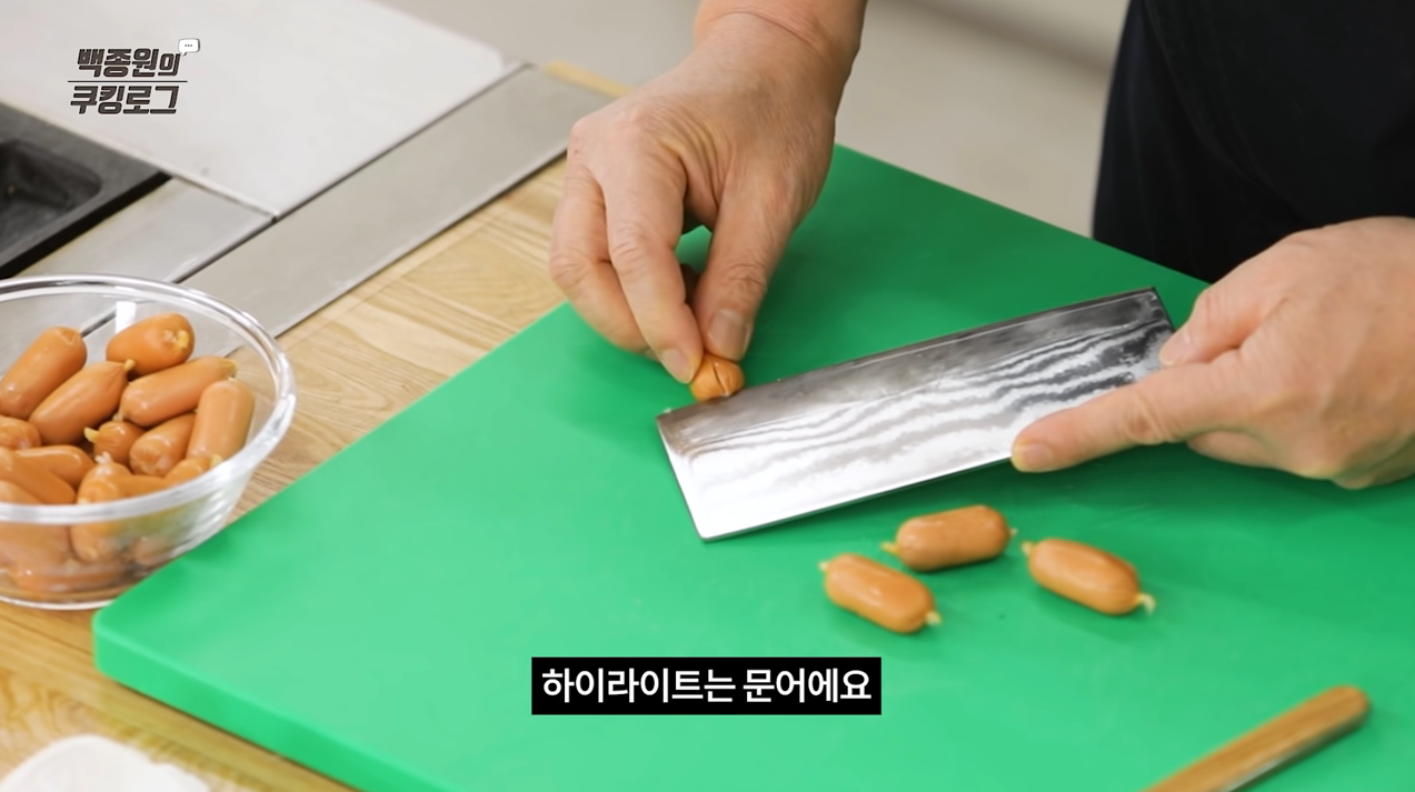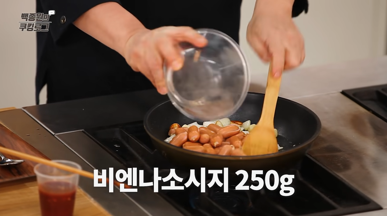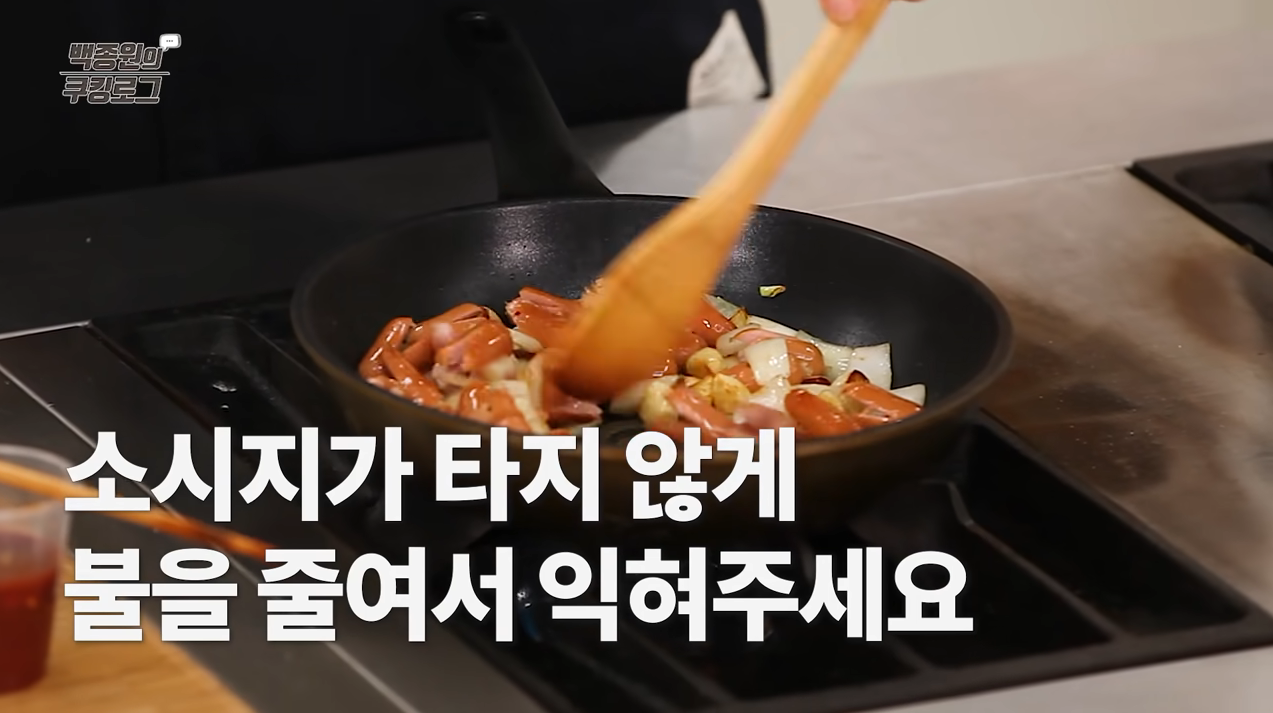 양파가 투명해지면 소시지를 넣어 칼집이 벌어질 정도까지 볶는다.