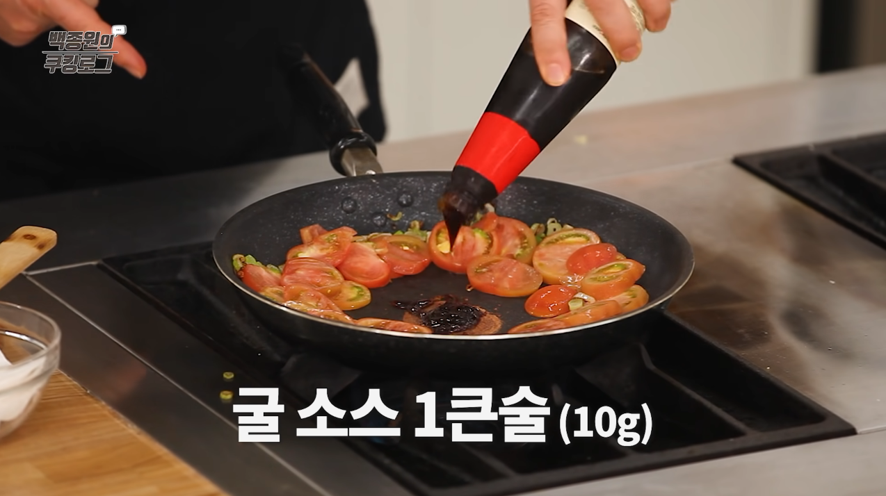 프라이팬 바닥에 진간장, 굴 소스를 넣고 누르듯이 볶아준다.