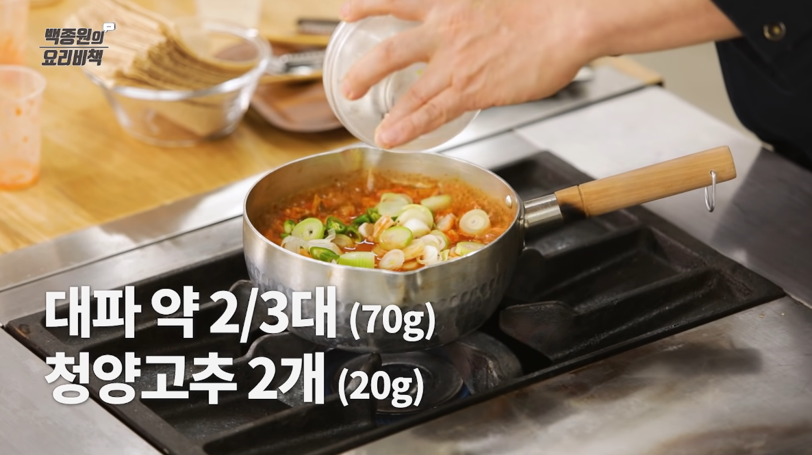찌개가 팔팔 끓으면 대파, 청양고추를 넣는다.