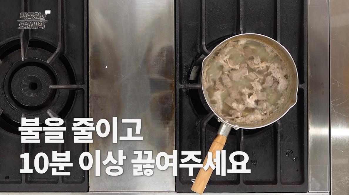 찌개가 끓어오르면 중 약불로 줄인 후 고기가 무를 때 까지 최소 10분 정도 끓인다.