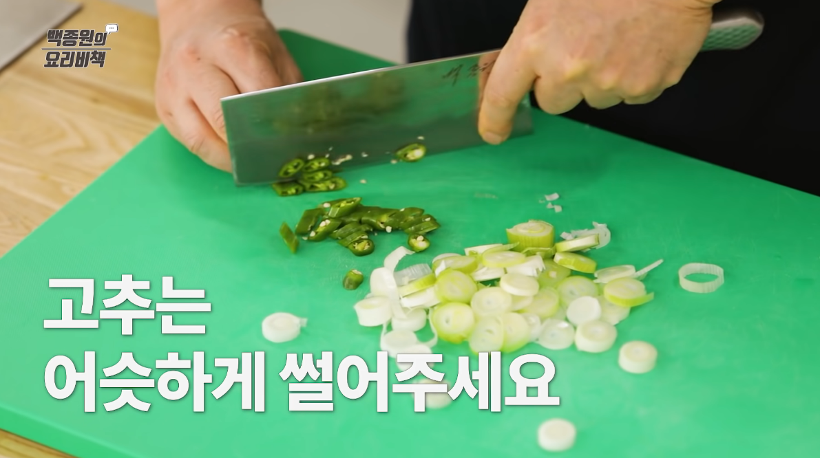 청양고추는 두께 0.5cm로 어슷썬다.