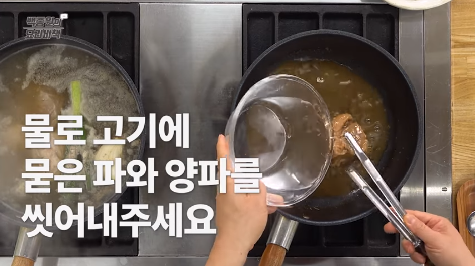 물로 고기에 묻은 파와 양파를 씻어준다.