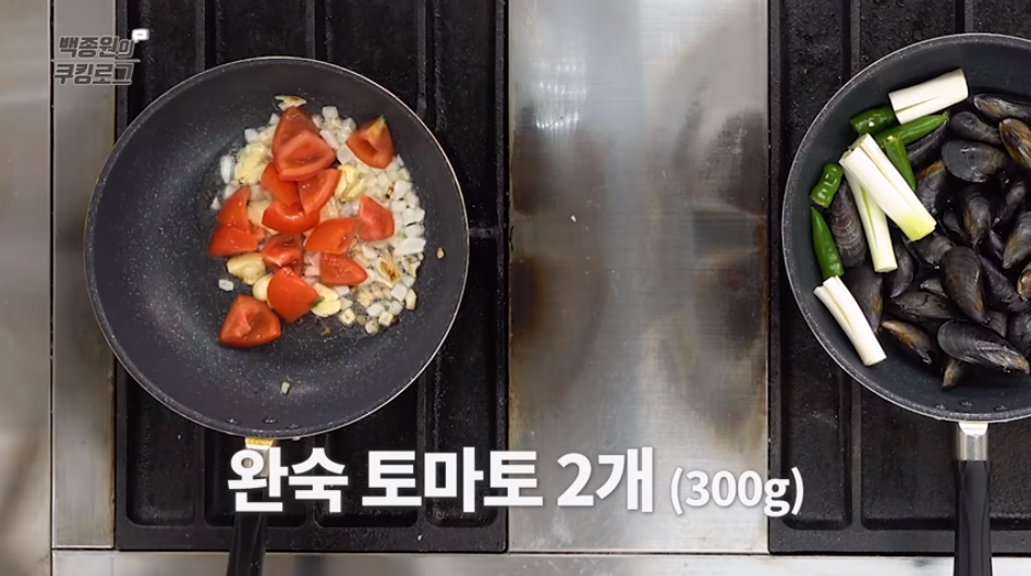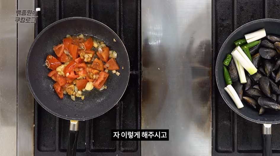 토마토를 살짝 볶아주다가 손질한 홍합을 넣어준다.
