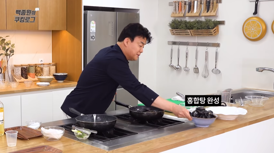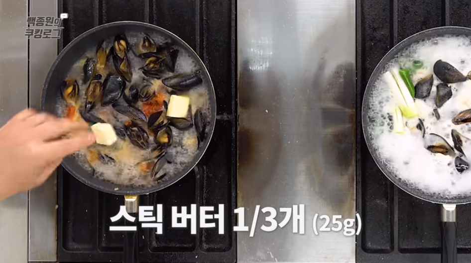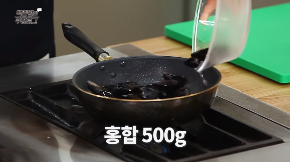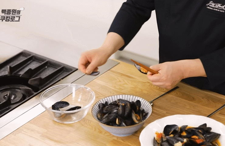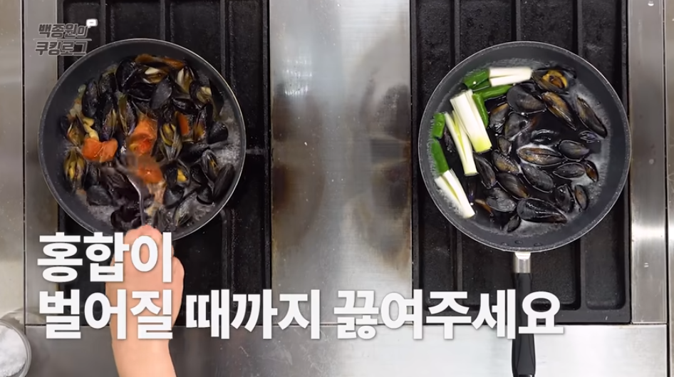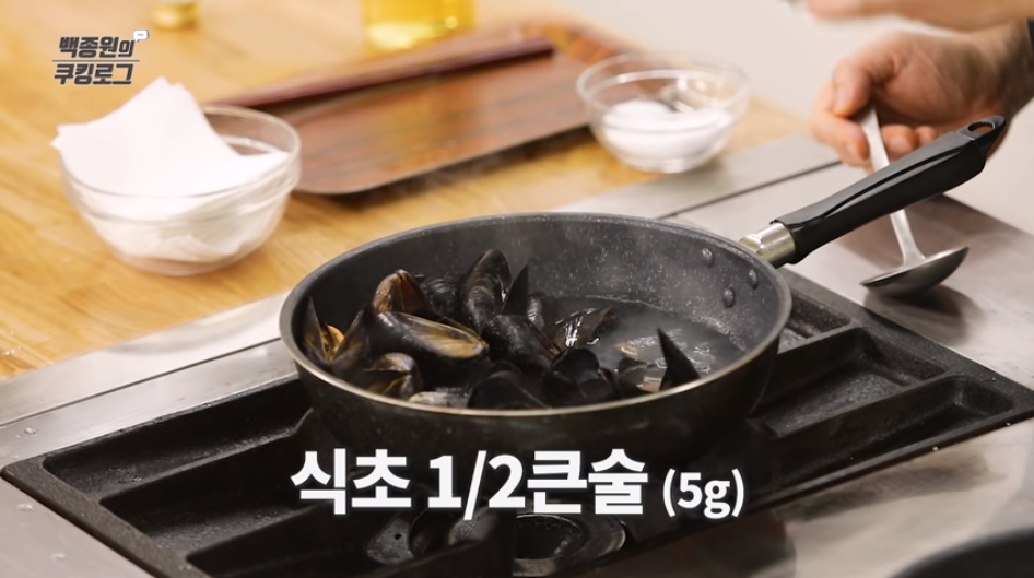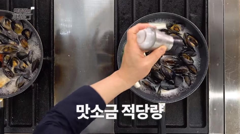 홍합이 입을 열면 간을 보고 부족한 간은 맛소금으로 맞춰준다.