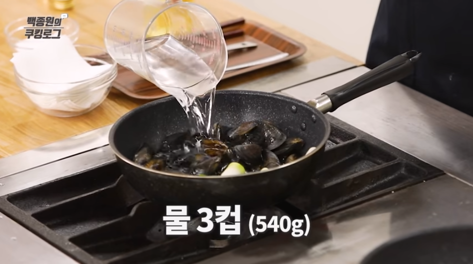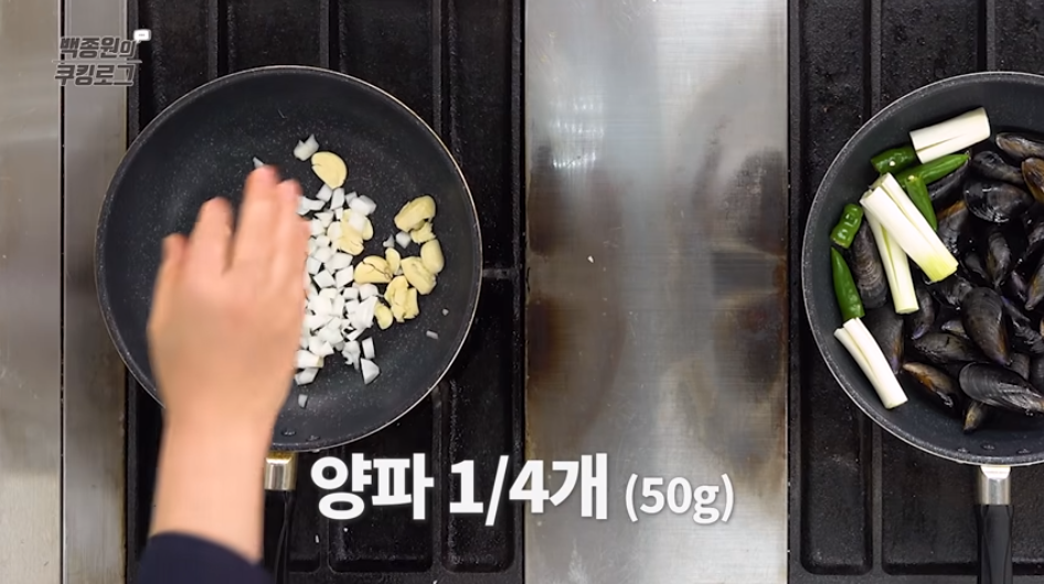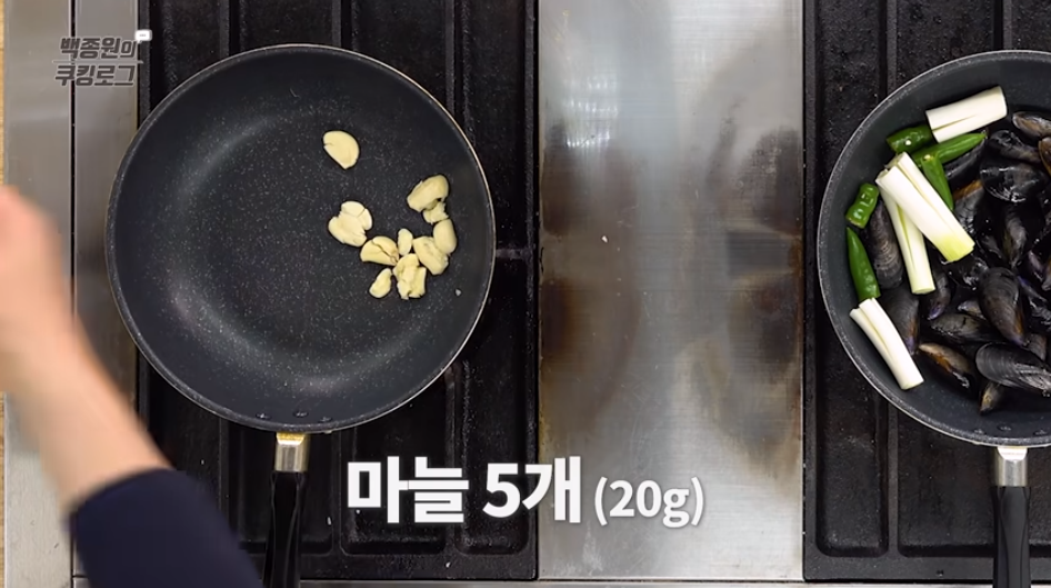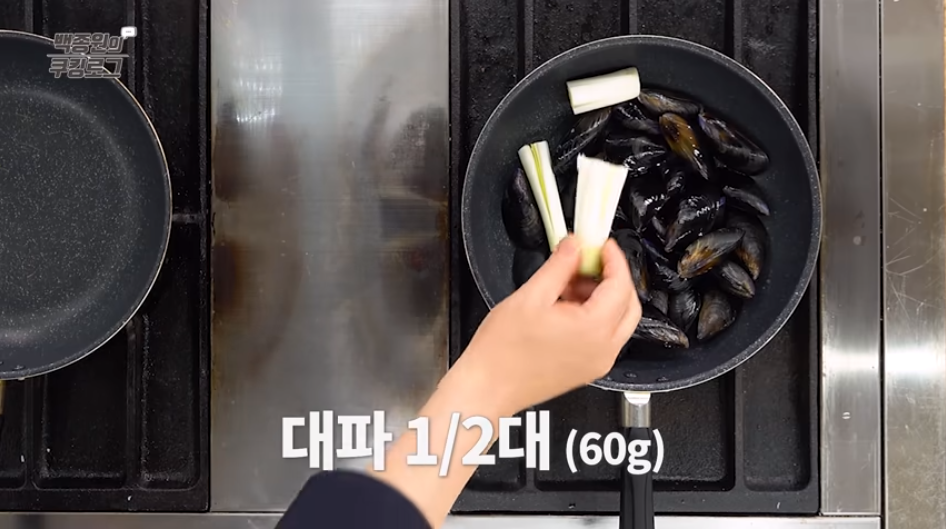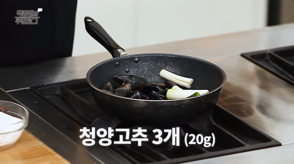 깊은 팬에 홍합과 물, 대파, 청양고추를 넣어 끓여준다.