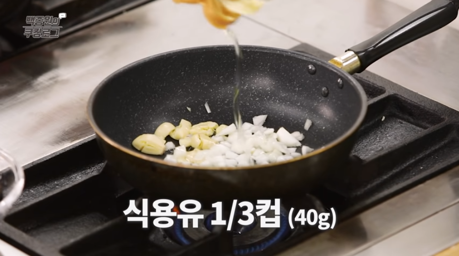 깊은 팬에 식용유를 두르고 다진 양파와 으깬 마늘을 넣고 색이 날 때까지 볶아준다.