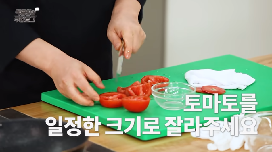완숙 토마토는 꼭지를 제거하고 반 갈라 씨를 제거하고 썰어준다.