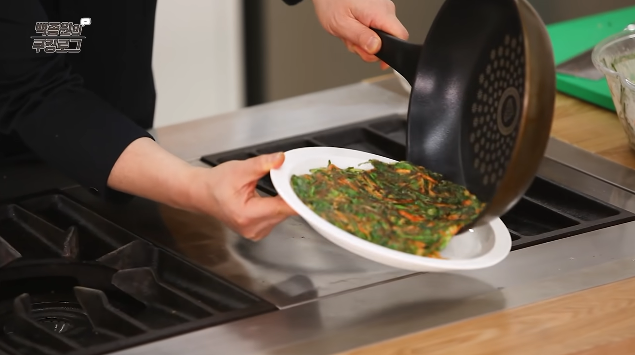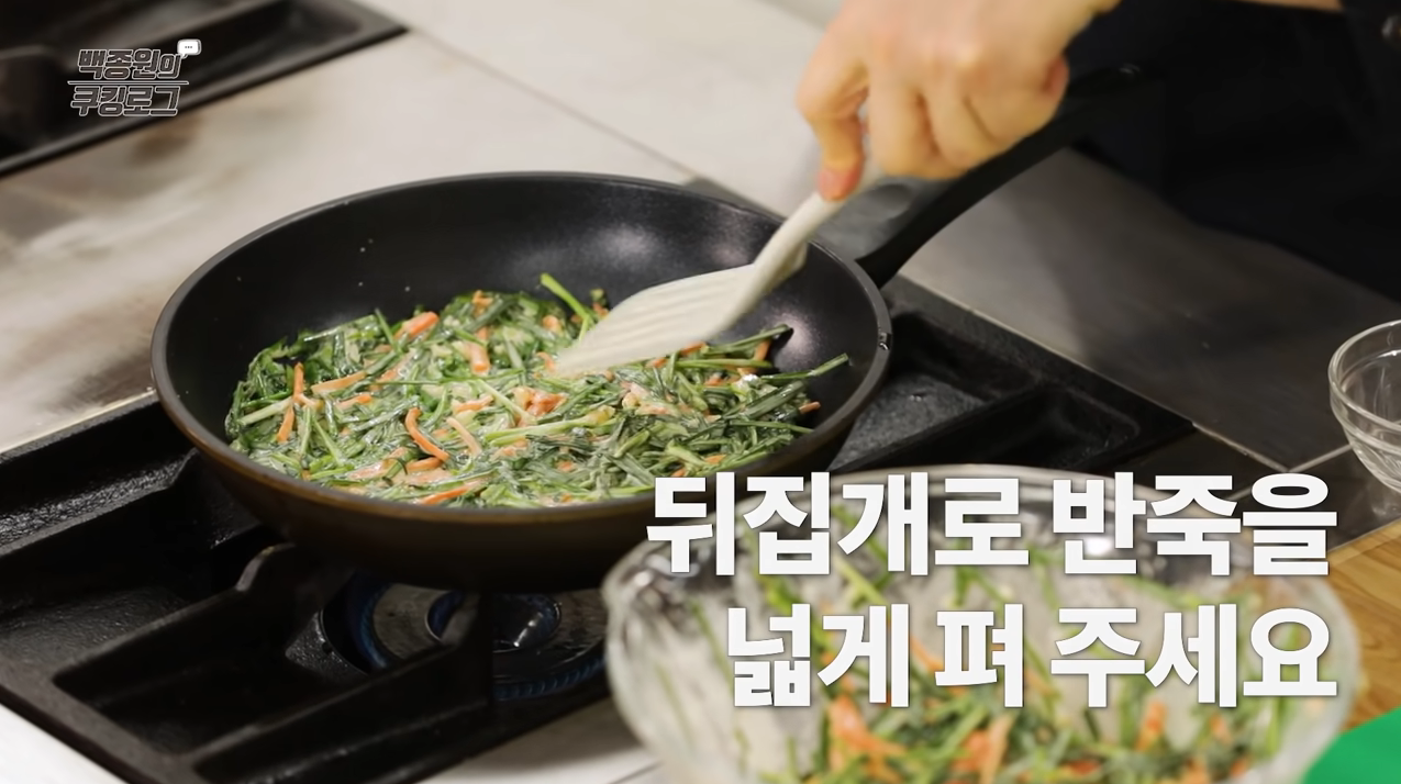 프라이팬에 식용유를 두르고 약한 불에서 반죽을 얇게 펼친다.
