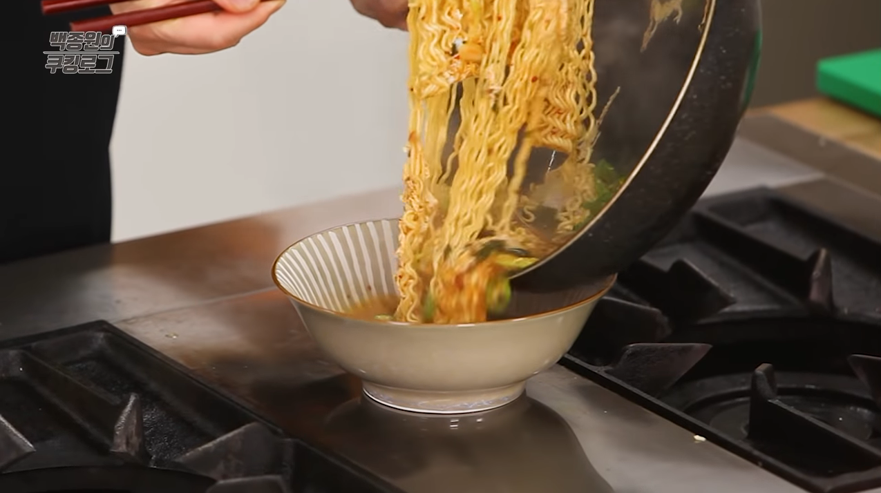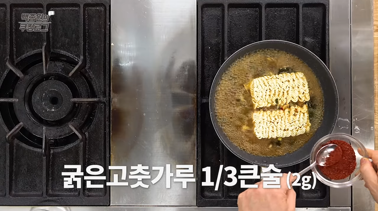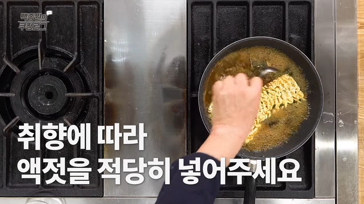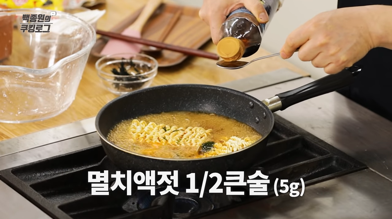 물이 끓으면 라면, 고춧가루, 멸치 액젓을 넣어 끓인다.