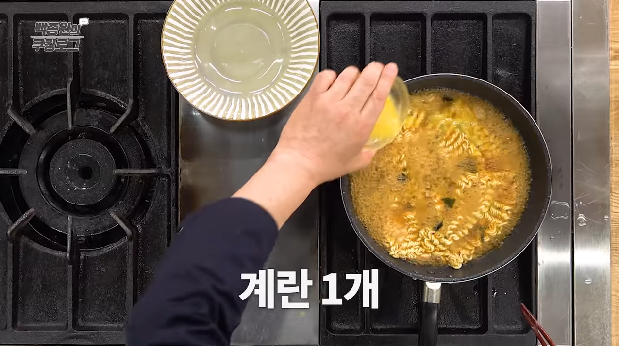 면이 반 정도 익으면 달걀을 잘 풀어 넣고 청양고추를 넣는다.